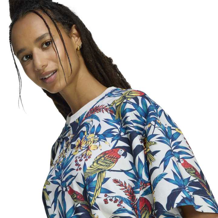 Το φόρεμα adidas x FARM Rio συνδυάζει τη ζωντανή κουλτούρα του δρόμου με το μοντέρνο αθλητικό σχεδιασμό. Μέρος της συλλογής Courts of Culture, τιμά την ενέργεια των γηπέδων μπάσκετ στο κέντρο της πόλης με τα τροπικά μοτίβα της FARM Rio.
